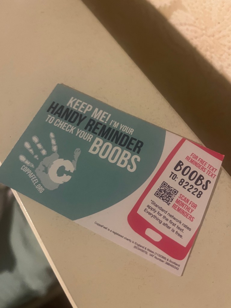 It was not the only item I acquired that day on breast cancer awareness. They also provided me with a helpful reminder to regularly examine my breasts (pictured below).